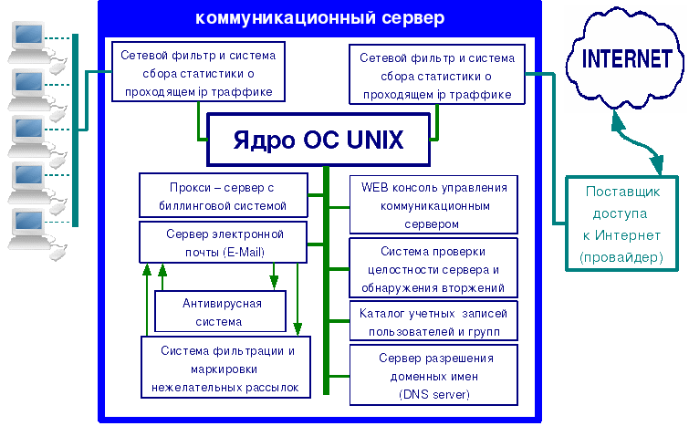 - реализует сервисы - электронной почты с защитой от спама и вирусов и контрольно - перлюстрирующим модулем, прокси сервер с биллингом, сетевой фильтр с коллектором статистик,