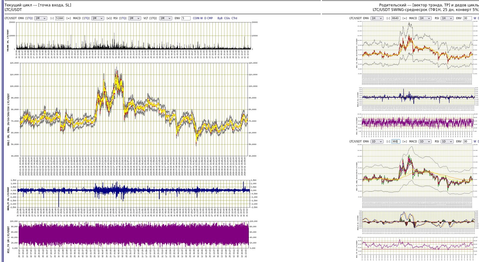 полугодовой. Зачем ? Получется сверхнаглядная вложенность соответствующих циклам волн цен и индикаторов, но в какой конкретно момент продолжится движение вверх или вниз эта конструкция не очень то и скажет. Ведь регулярно случаются