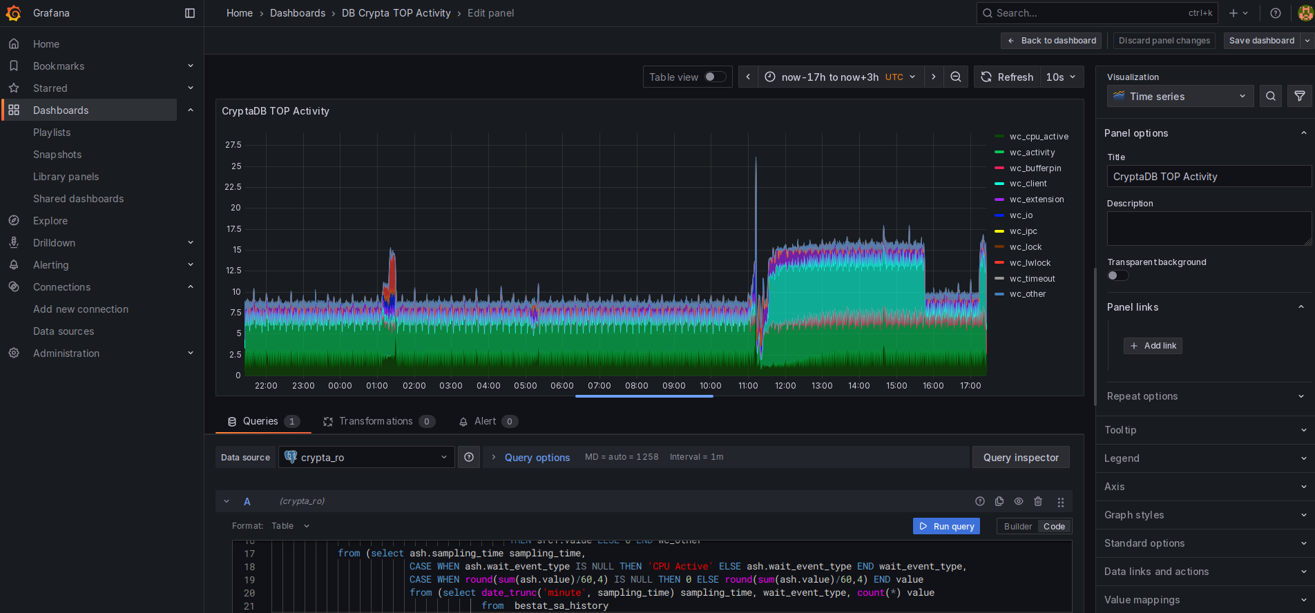 Теперь - как собирать данные сырые ? В моём случае создана табличка, в которую ежесекундно складывается текущий срез состояния из pg_stat_activity. Делается это отдельной функцией внутри кластера БД postgre SQL, но запускается сбор статистики в виде юниксового