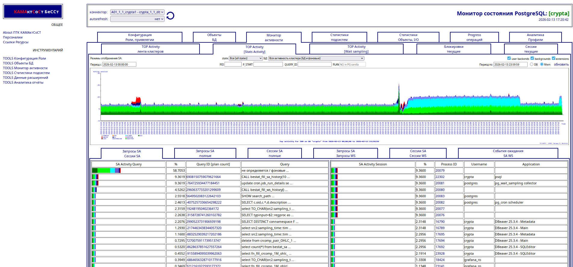 построить активность всей СУБД, а также показать ТОП сессий и запросов, и провалиться в них, чтобы посмотреть распределение по классам событий ожидания уже конкретную сессию или запрос. Этот продукт со мной с 2006 года, почти 20 лет,