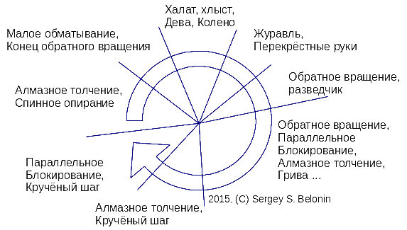 ткущей девы), начала потереть стопу или стопы - вихря), переход в конце вращения плеч, шесть запечатано перед толчком (также конец вращения плеч, конец гривы лошади, конец конного разведчика), алмазное